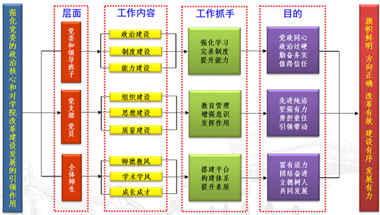 改革建设发展的引领作用为出发点,以旗帜鲜明、方向正确、改革有效、建设有序、发展有力为落脚点,在领导班子、支部党员和全体师生三个层面推动党建工作”的实施路径,从宏观思路和具体路径两个维度对党建工作进行科学谋划和系统推进,为党建工作质量提升和幸运28论坛