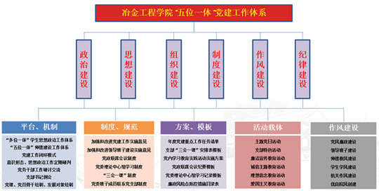 各项事业持续进步为总目标”党建体系构建思路,初步构建了“五位一体”党建工作体系。该体系由三个层次构成,顶层为全面提升党建工作质量这一总目标,中间层包含了党的政治建设、思想建设、组织建设、制度建设、作风建设、纪律建设六大任务,底层由平台机制建设、制度规范建设、方案模板制定、活动载体创建、作风建设五大模块组成,各个模块相互关联,各层次彼此支撑,从而形成了一个科学完备系统的工作体系。