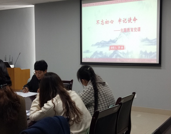 首先,由支部书记罗帅同志为支部成员讲授了题为《不忘初心,提高党性修养水平;牢记使命,发挥先锋模范作用》的专题党课。他指出:从中国共产党成立,经过28年的新民主主义革命时期,无数先辈们抛头颅洒热血,不懈奋斗,成立新中国实现民族独立和人民当家作主;到经历风云变幻、严峻考验的社会主义革命和社会主义建设时期,成功的跨越了一道又一道难关,夺取了一个又一个胜利,才有了今天的中国走向全面复兴、加速崛起的新征程。中国共产党人的初心和使命,就是为中国人民谋幸福,为中华民族谋复兴。同时,罗帅还要求各党支部成员,不忘入党初心,牢记新时代社会主义青年大学生使命,做到理论学习有收获、思想政治受洗礼、学习科研有作为、思想意识辨是非、身体力行重实践。