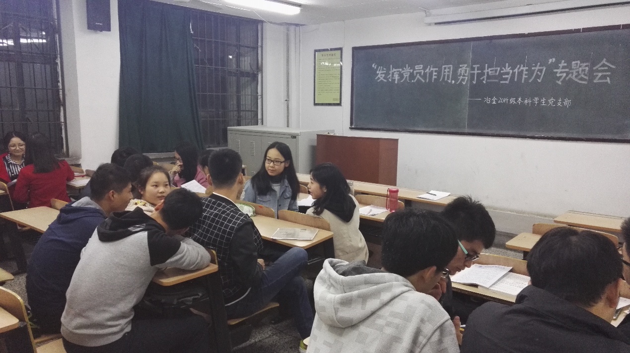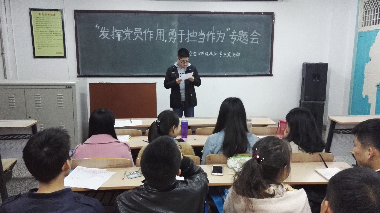 为全面推进“两学一做”学习教育,深化党员学习教育成效,2016年11月3日晚,我院2014级本科学生党支部于教学大楼313教室,召开了“两学一做”第四次教育专题——“发挥党员作用,勇于担当作为”讨论会。党员同志和积极分子参加了学习和讨论。本次专题讨论会由学生党员黄科华。