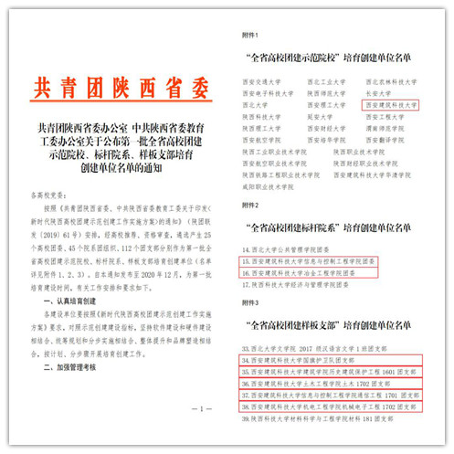 为深入贯彻习近平新时代中国特色社会主义思想和党的十九大精神,贯彻落实中央党的群团工作会议、全国教育大会和高校思想政治工作会议精神,按照《高校共青团改革实施方案》要求,坚持立德树人,进一步发挥高校共青团在“大思政”工作格局中的重要作用,切实加强新时代全省高校共青团基层建设,共青团陕西省委和陕西省委教育工委联合印发了《新时代陕西高校团建示范创建工作实施方案》。结合文件精神,我校团委高度重视,精心组织,按照要求遴选推荐相关组织申报示范创建单位。经资格审查和评审,共产生25个高校团委、45个院系团组织、112个团支部分别作为第一批全省高校团建示范院校、标杆院系、样板支部培育创建单位。