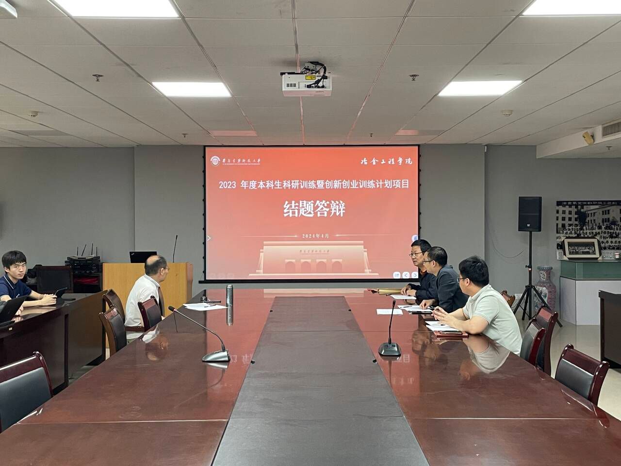 在工科大楼1106会议室,2023年大创项目负责人精心准备PPT,结合结题要求陈述课题成果以及项目组成员在课题的实际工作。2024年新申请立项的同学提前来1106会议观摩学习上一年度的结题答辩会,同时项目负责人也精心准备PPT,围绕着对项目的认识和项目中如何开展进行讲述。三位评委老师认真听取汇报,并质询结题成果及开展情况。