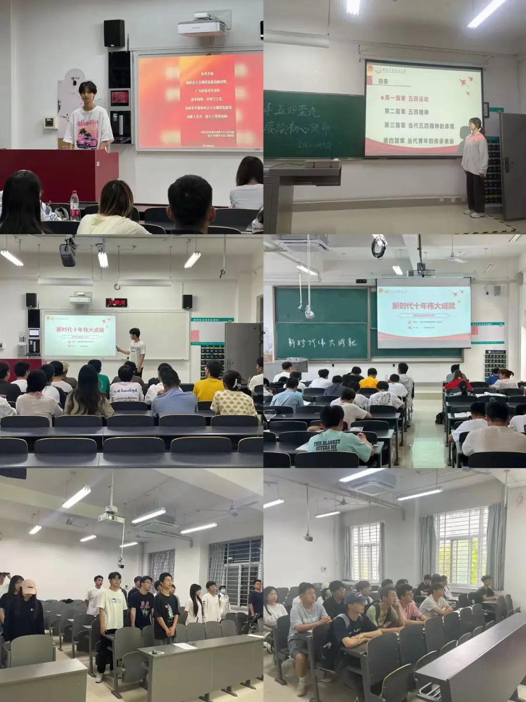 青年学子授课。过程中,老师为同学们播放新时代近十年伟大成就视频以及向同学们讲述伟人事迹,帮助同学们了解新时代十年伟大变革,感受新时代发展之快,明确自身目标,同时有助于激发我院学子的爱国热情,增强责任意识,努力成为一名推动祖国未来发展的、对社会有贡献的新时代青年。