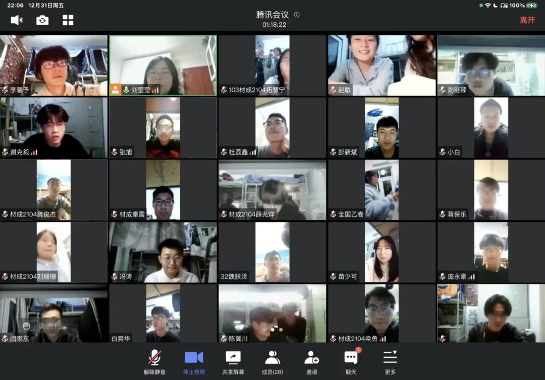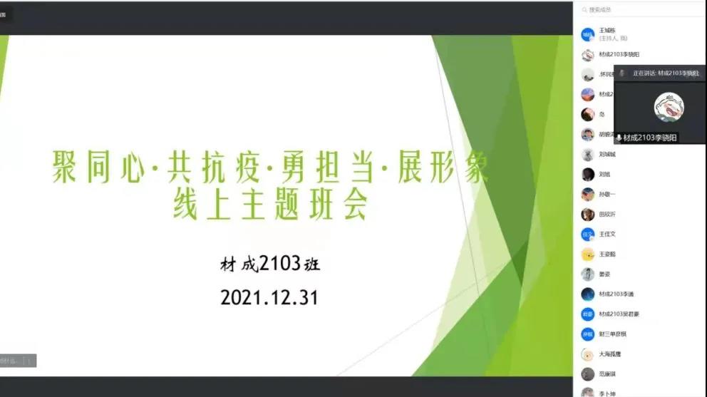 于2021年12月31号晚开展了“聚同心、共抗疫、勇担当、展形象”线上主题班会。此次主题班会由各班班主任主持召开,2021级各班全体同学参与。