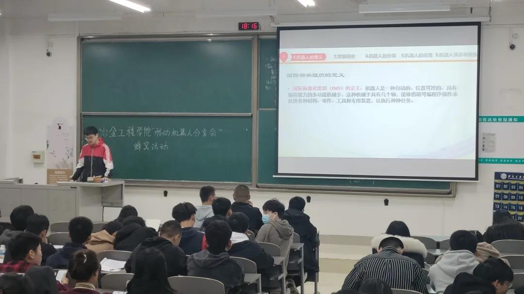 活动伊始,封陆洋同学向同学们解释了机器人名字的由来及不同组织对机器人的定义,用图片展示了多种机器人类型,并且播放了他们团队调试的机器人的视频。接着,他详细介绍了机器人在国内外的发展历程及如今设计机器人排名前列的国家。