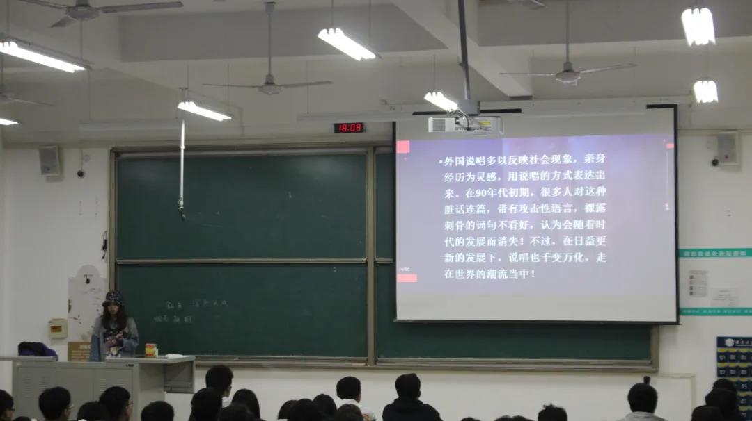 随后,谢雨杉同学向大家着重介绍说唱,同时告诉同学们随着时代的变化,说唱文化不但没有被淘汰,反而被更多的人认可。接下来,谢雨杉同学列举出与hip-hop说唱有关的例子,并从hip-hop说唱的团体,赛事节目以及音乐厂牌三个方面继续向大家详细介绍,使同学们对hiphop说唱有了更深入的了解,激发了同学们对hip-hop文化的热情。最后谢雨杉同学播放了hip-hop说唱的相关视频,并向同学们传达出“每一种文化都值得尊敬”的理念。