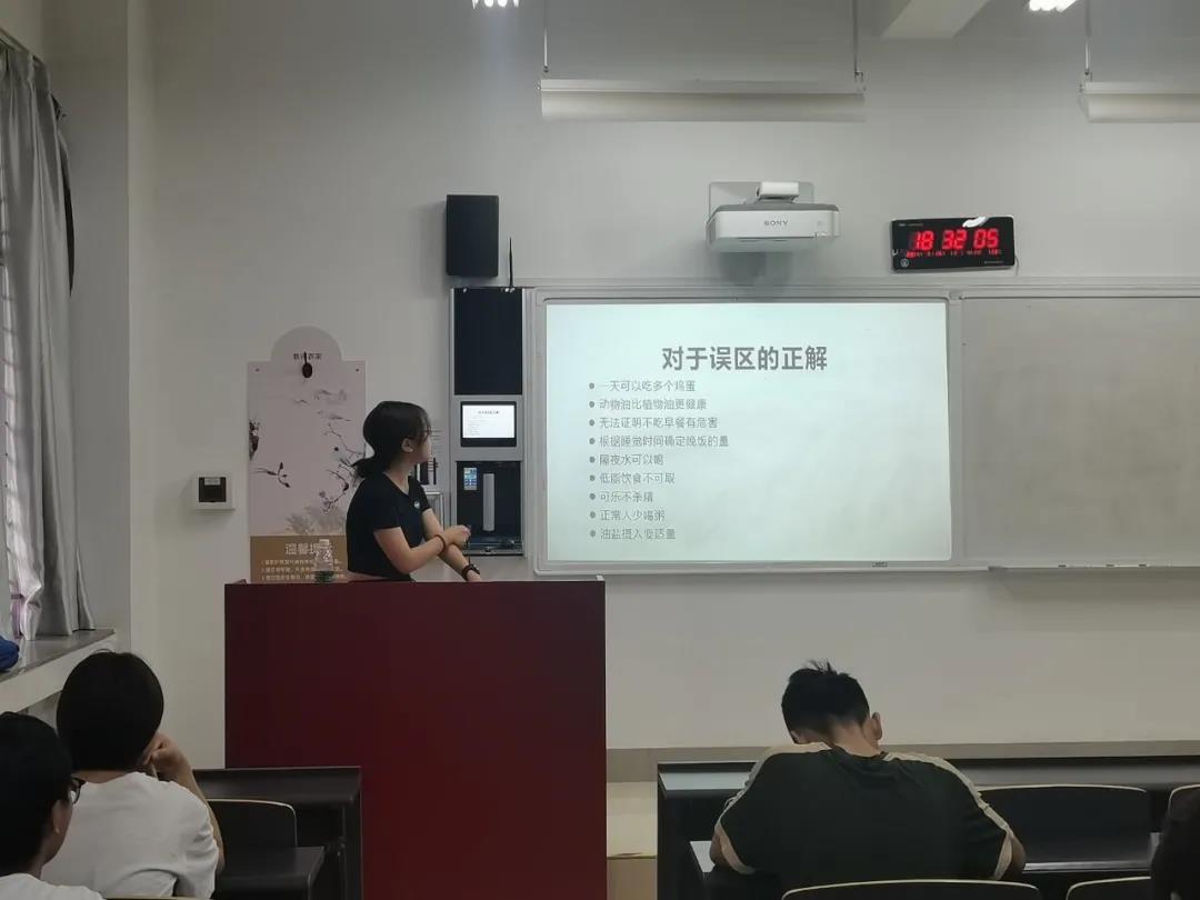 活动开始,滕燕霜同学指出了日常饮食中存在的一些误区,比如“一天可以吃多个鸡蛋”“不吃早餐没有危害”等。并对这些误区一一纠正,接着,滕燕霜为同学们介绍了一种健康、富含营养的饮食——“地中海式饮食”,长期坚持地中海式饮食可以预防心脏病、糖尿病、心血管疾病。