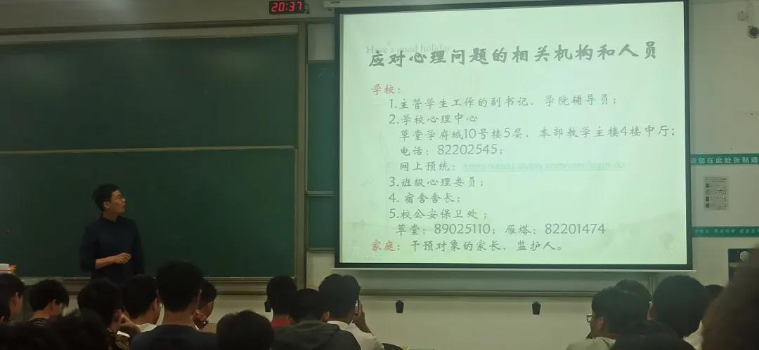 其次,罗帅老师向同学们提到了心理委员和舍长在日常生活中的定位与职责。他们在班级中是班干部是心灵使者更是关键时候的信息员。心理健康教育有五级体系,第一级是周围的同学,第二级是舍长,第三级是心理委员,第四级是导员,第五级则是学校心理中心。罗帅老师着重强调了心理委员和舍长的工作及日常需要关注的同学类型,避免心理危机的出现进而形成悲剧。