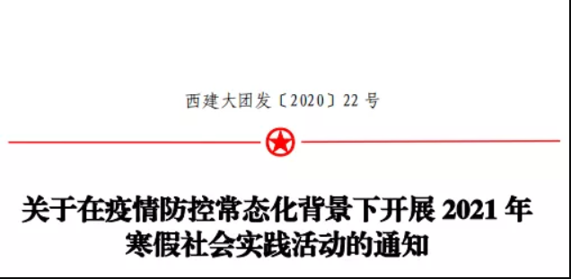 为深入学习贯彻党的十九届五中全会精神和习近平新时代中国特色社会主义思想,引导广大学生自觉践行和传播社会主义核心价值观,通过社会观察和亲身实践,感悟党领导人民建设祖国新的伟大成就,领悟习近平新时代中国特色社会主义思想的丰富内涵,全面理解新发展阶段、新发展理念、新发展格局,提升广大团员青年作为社会主义事业建设者和接班人的自觉性,进一步坚定为实现中华民族伟大复兴中国梦而努力奋斗的信念,在疫情防控常态化背景下校团委 决定组织开展 2021年寒假社会实践活动,现将有关事宜通知如下: