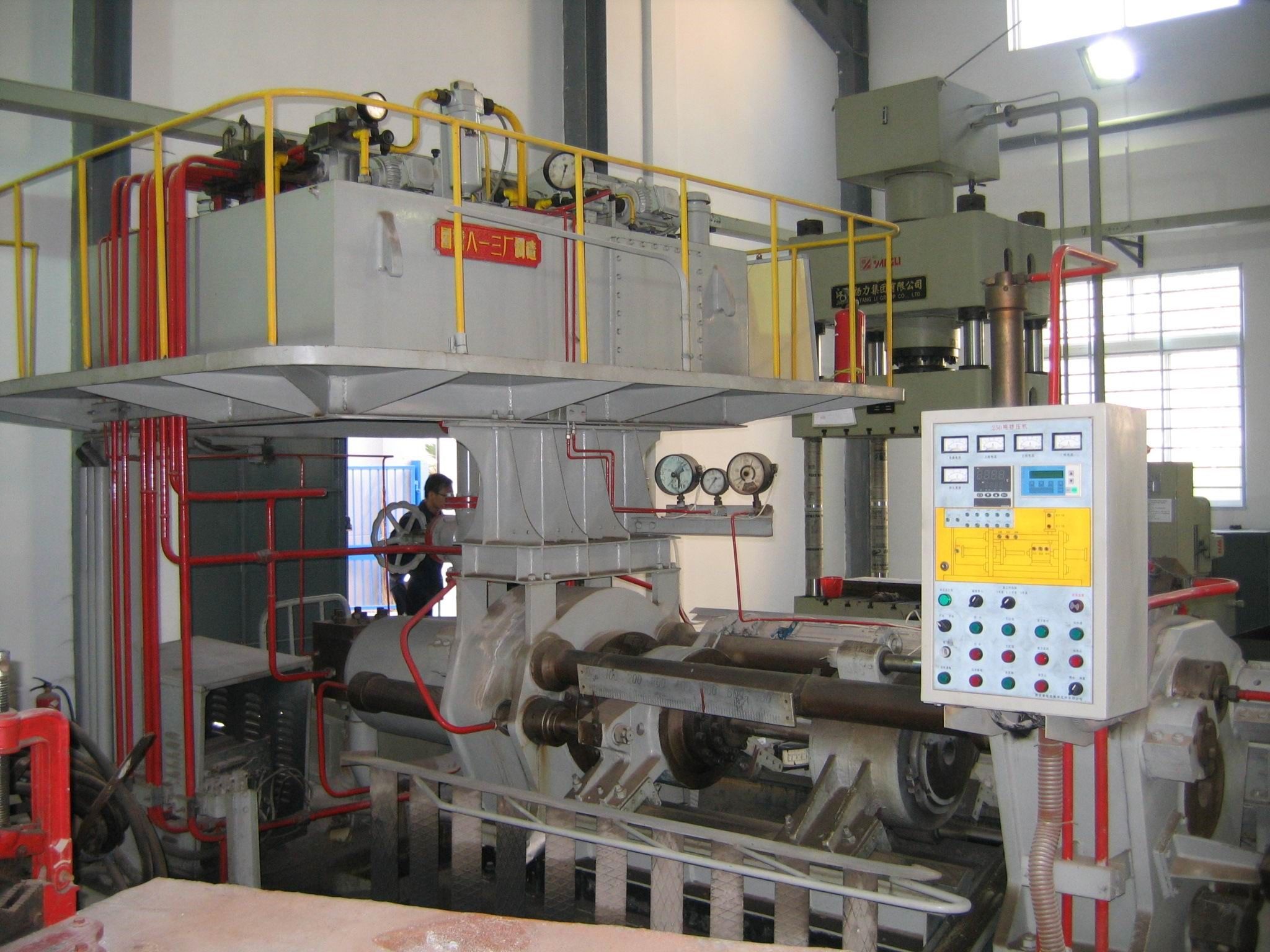 250t挤压机整机结构采四柱卧式、油箱上置、液压、电气整体安装,管路排列整齐、安装维修方便。具有极高的运行精度和结构刚性。工作压力250Kgf/cm2,试验压力320Kgf/cm2;挤压筒直径Φ65、Φ75,挤压筒长度450mm。适用于铝、镁、铅等金属及其合金的挤压加工,可生产管、棒及型材。